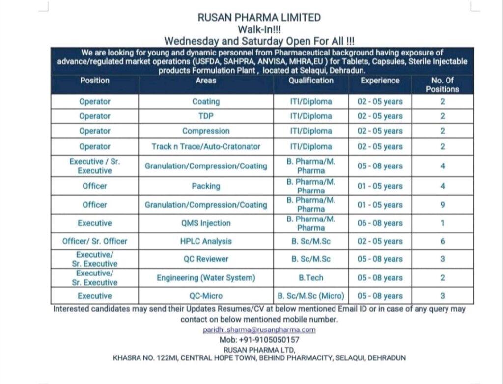 Hiring alert, at Rusan Pharma Ltd, Dehradun pharmaceutical plant which covers almost 85% of globe,which have maximum numbers of regulatory approvals in uttrakhand state.