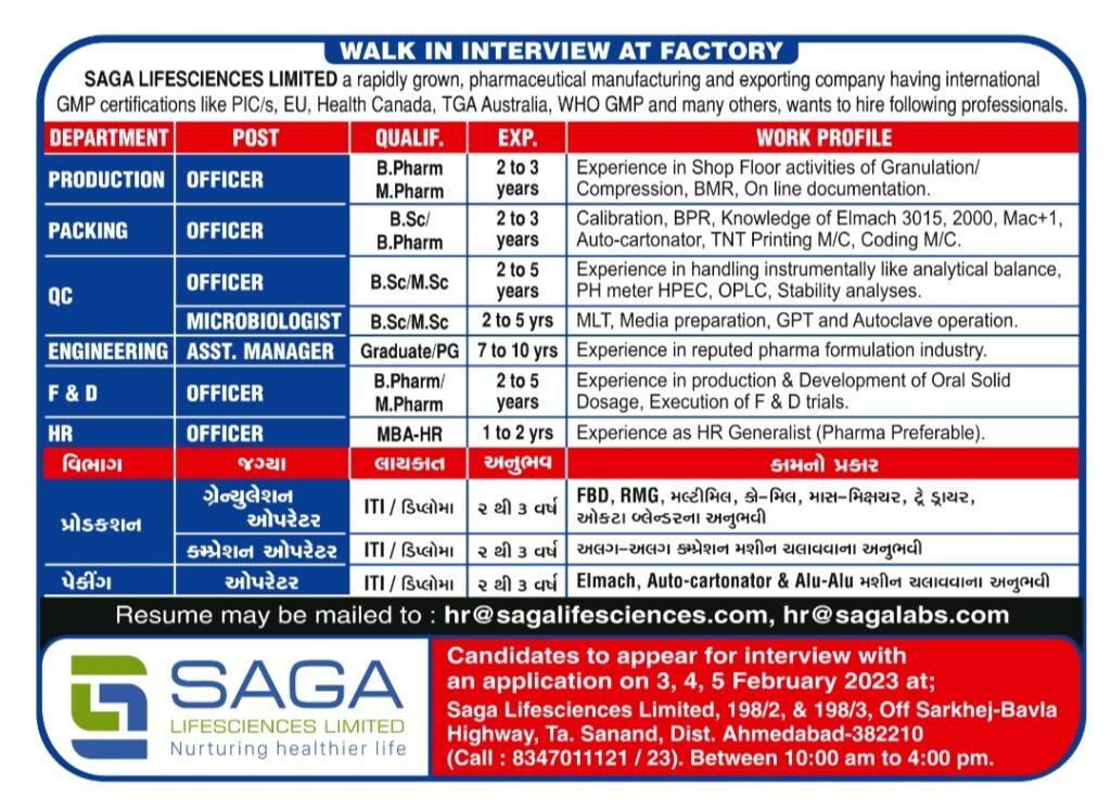 Saga Lifesciences- Walk In Interview for Production, Packing, Engineering, QC, F&D, HR on 3rd, 4th, 5th February 2023