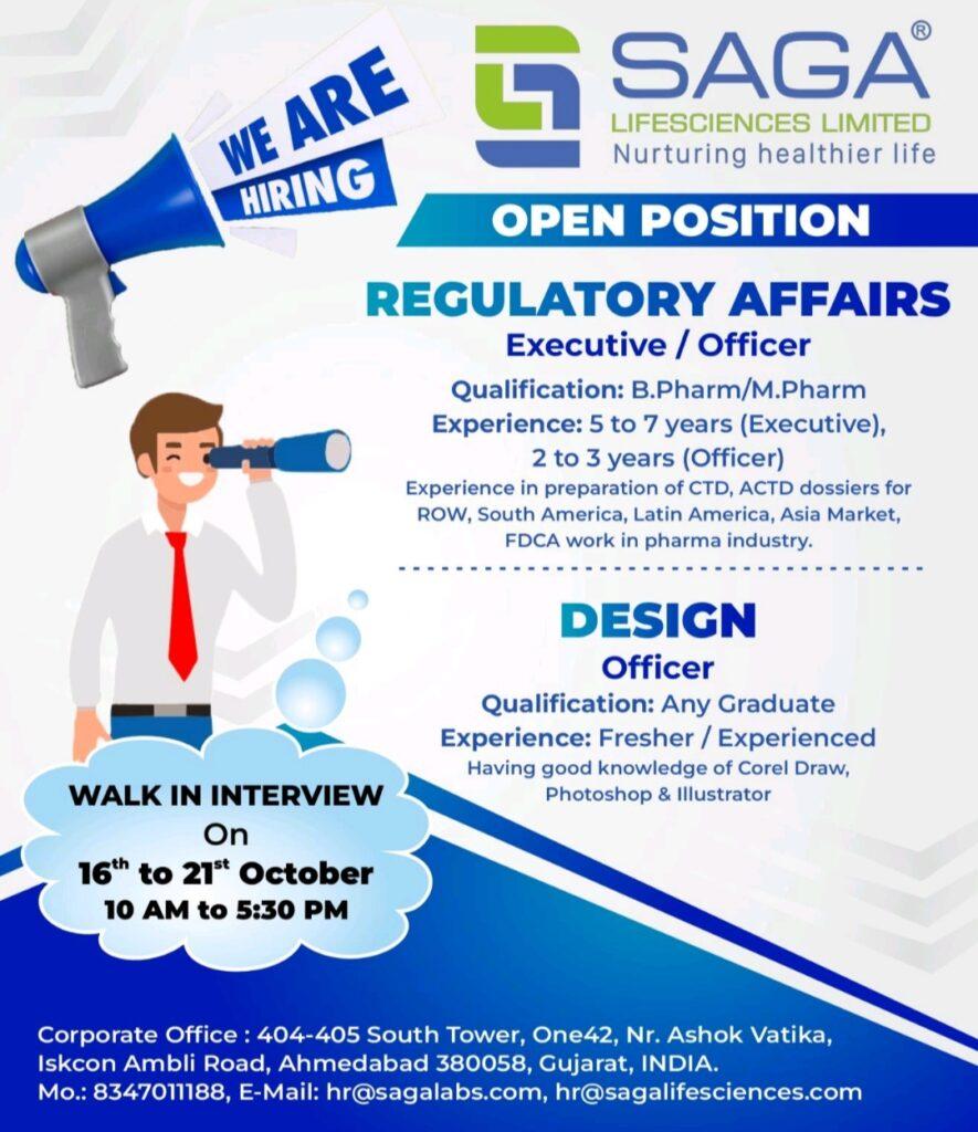SAGA LIFESCIENCES Walk in interview for Regulatory Affairs & Graphic Design officer on 16th to 21st October 2023