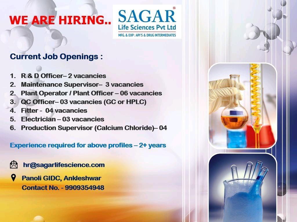 SAGAR Life Sciences Pvt Ltd hiring for R&D, Production, QC, Maintenance, Fitter & electrician at Panoli GIDC, Ankleshwar