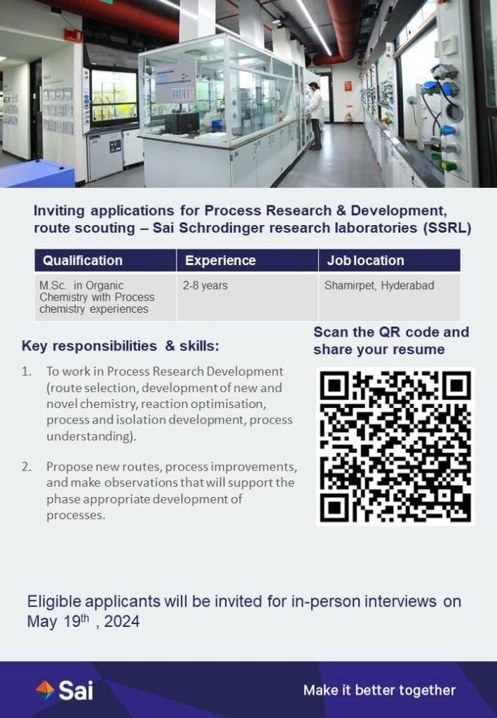 Inviting applications for Process Research & Development, route scouting – Sai Schrodinger research laboratories (SSRL)