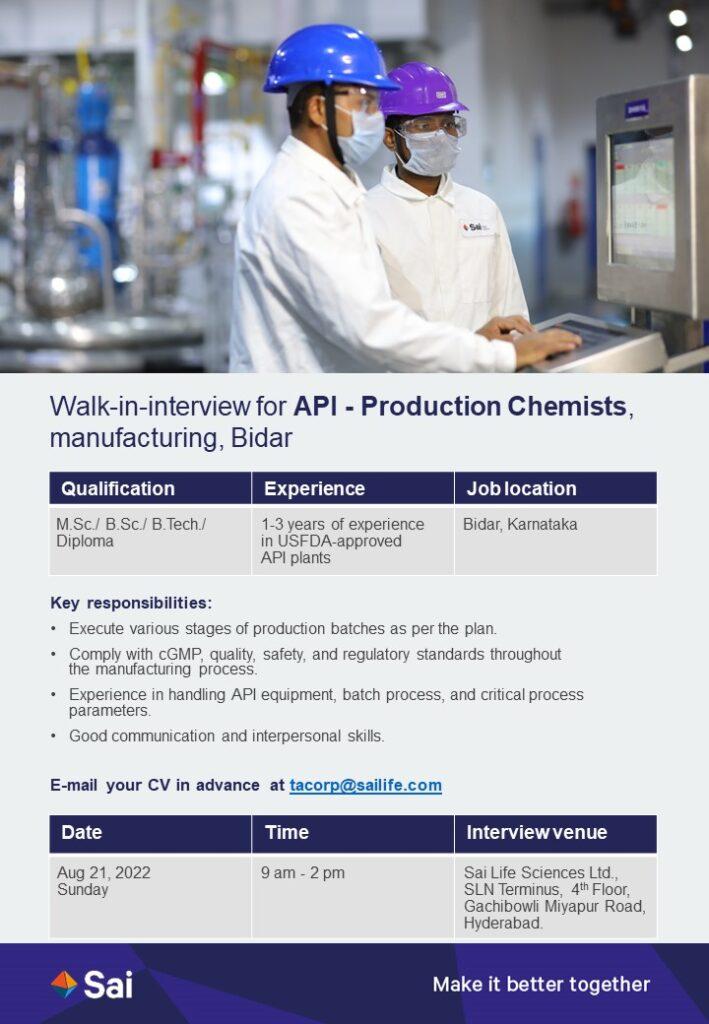 Sai Life Sciences Ltd Walk-in-interview for API – Production Chemists, manufacturing, Bidar on Aug 21, 2022 Sunday