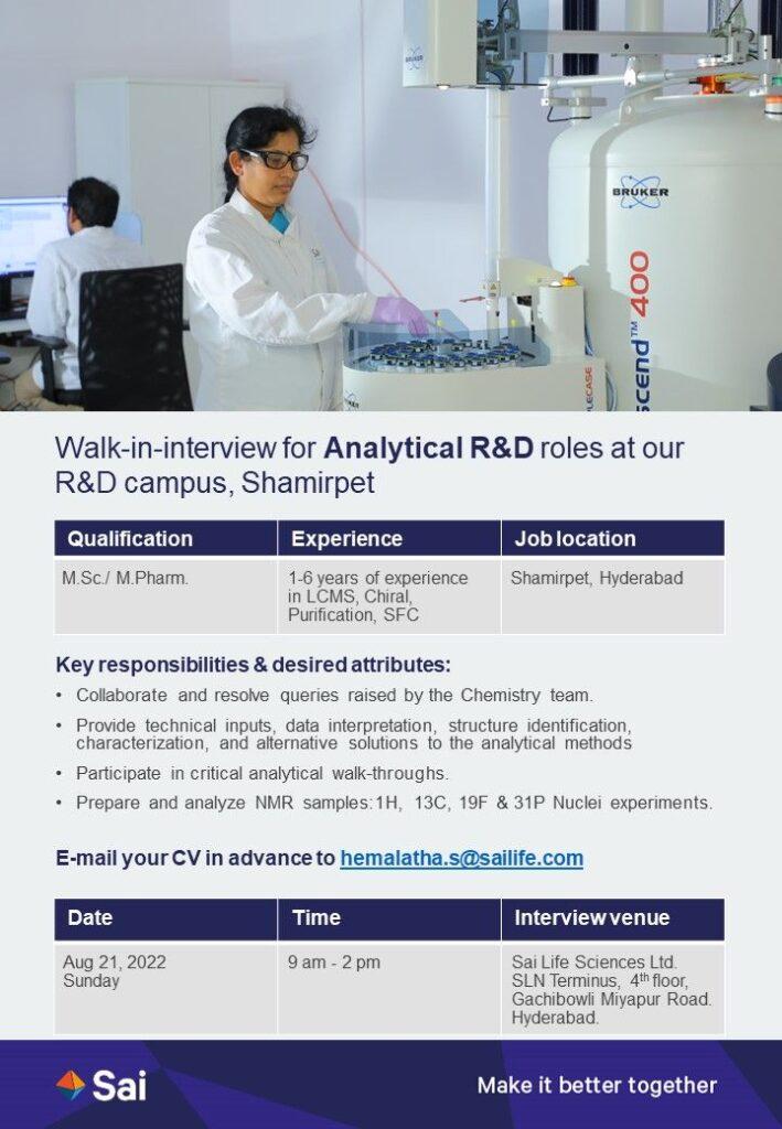Sai Life Sciences Ltd walk-in interviews for Analytical R&D roles on August 21, 2022