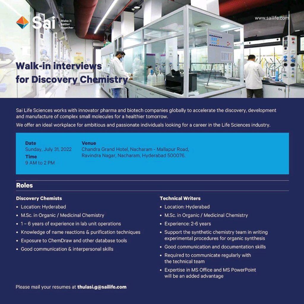 Sai Life Sciences Ltd Walk-in interviews for Discovery Chemistry and Technical writers on July 31, 2022