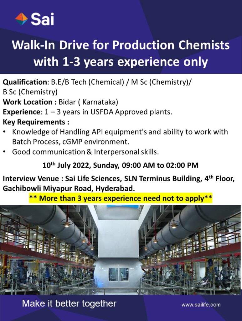 Sai Life Sciences Walk-In Drive for Production Chemists on 10th July 2022
