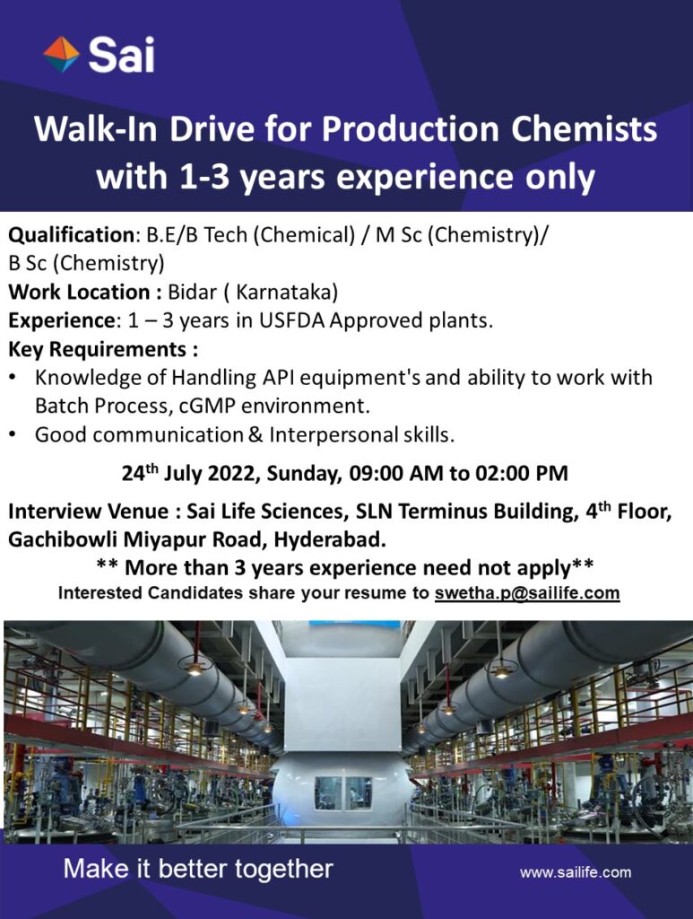 Sai Life Sciences Walk-In Drive for Production Chemists with 1-3 years experience on 24th July 2022, Sunday