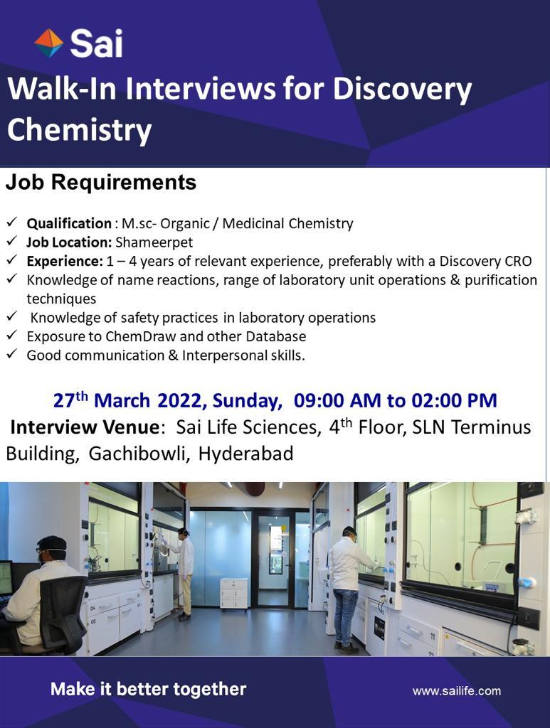 Sai Life Sciences, Walk-In Interviews for Discovery Chemistry on 27th March 2022 at Hyderabad