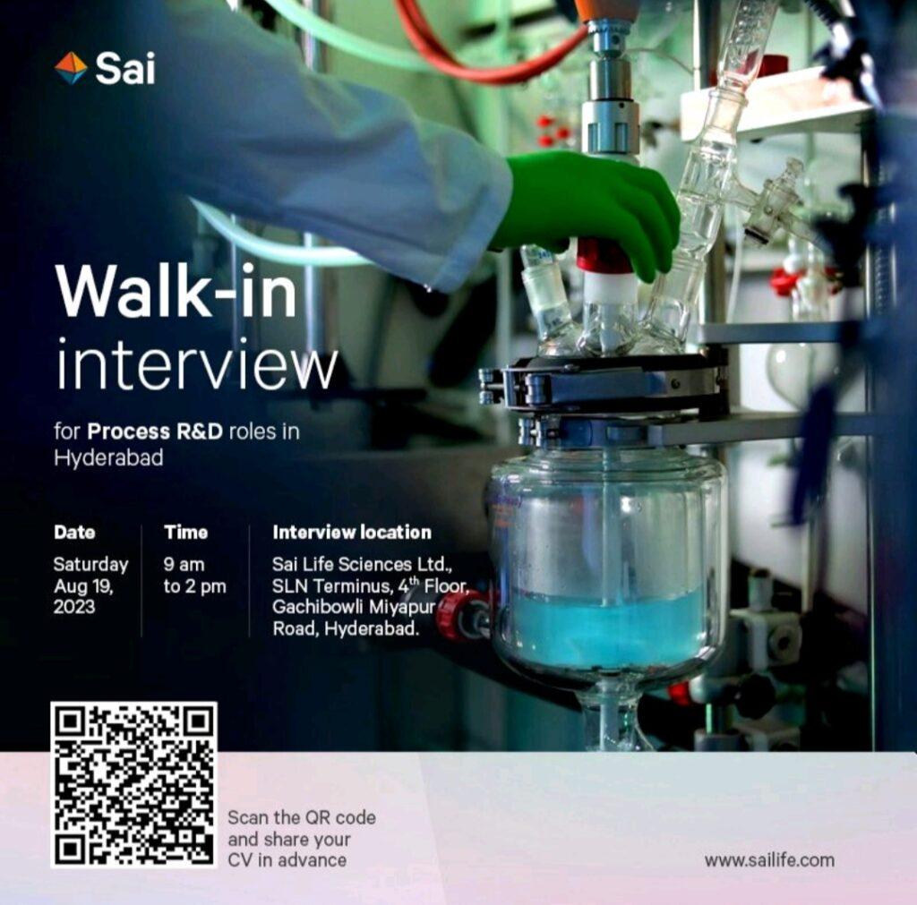 Sai Life Sciences– walk-in interviews in Hyderabad this Saturday, August 19, 2023, for multiple positions in the Process R&D department