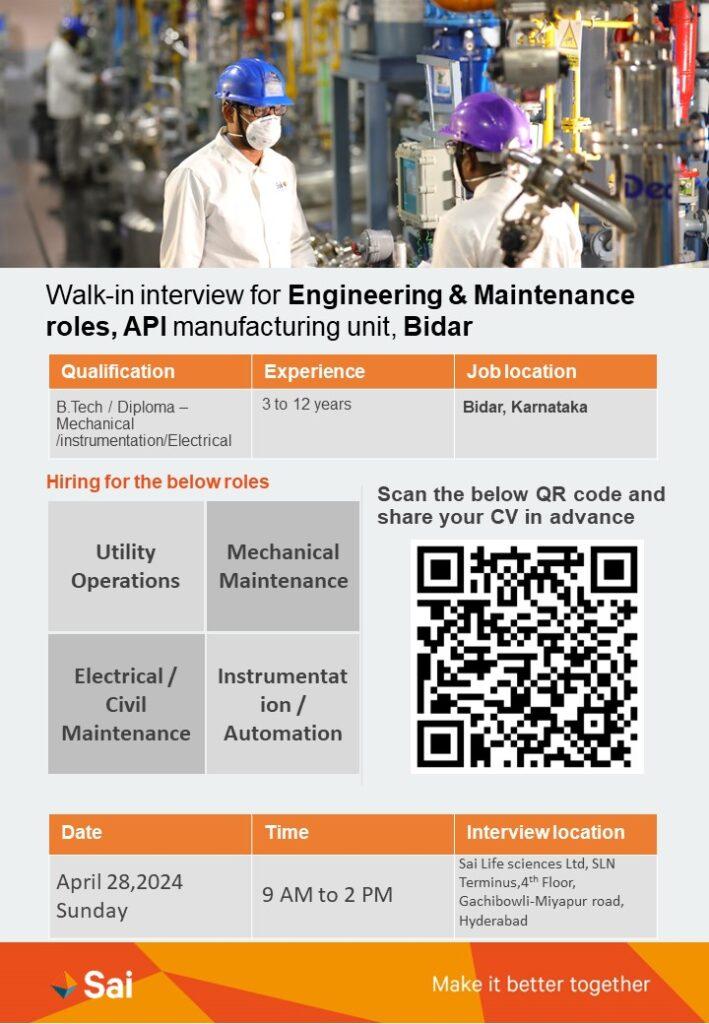 Walk-in interview for Engineering & Maintenance roles, API manufacturing unit, Bidar
