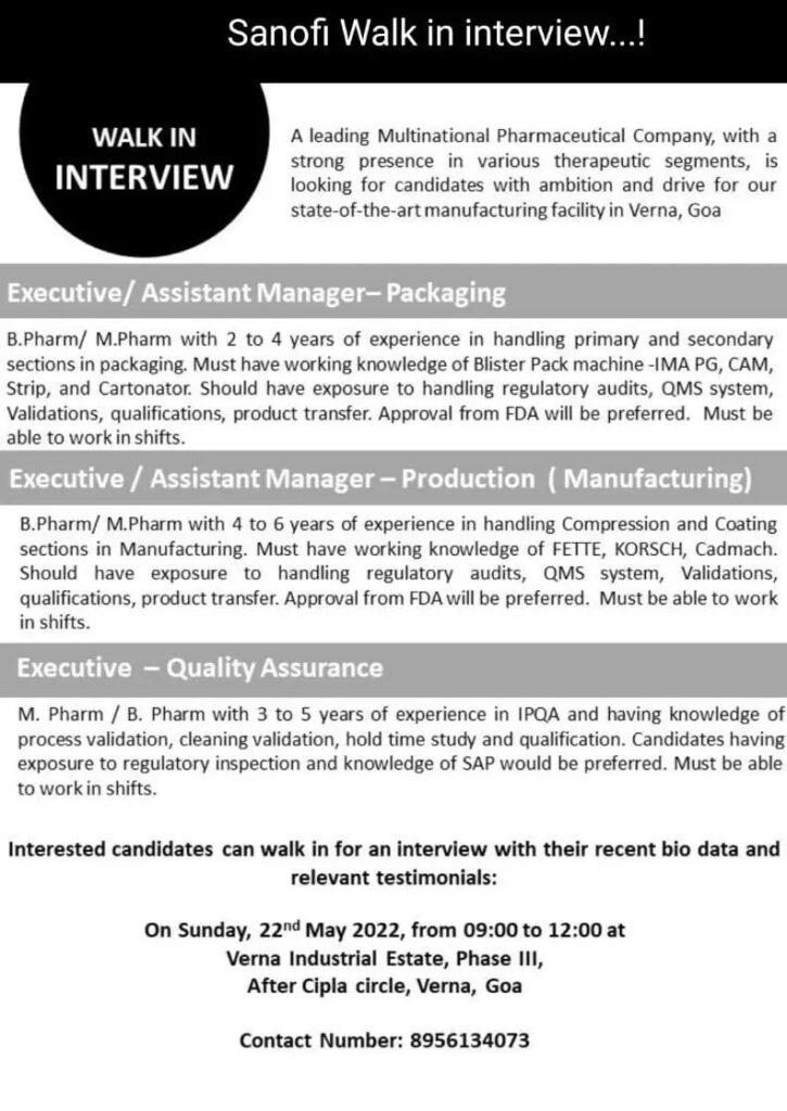 Sanofi Walk in interview at Verna, Goa on 22nd May 2022