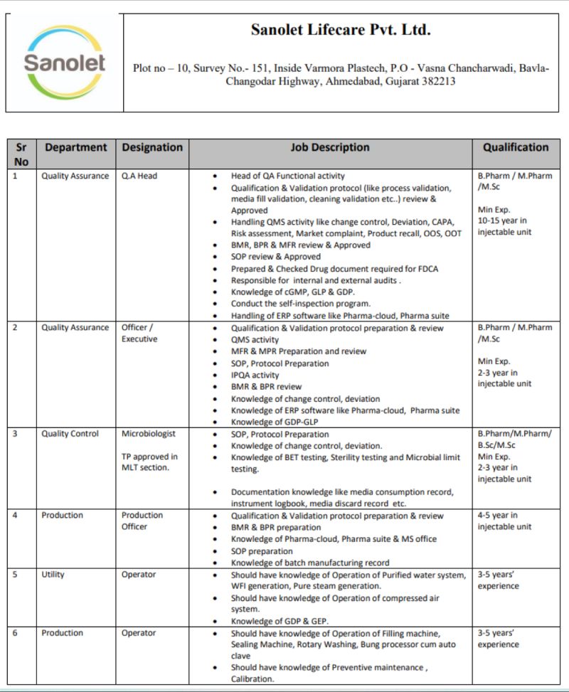 Sanolet Lifecare Pvt Ltd Job opening for Quality Assurance, Quality Control, Production & Utility department