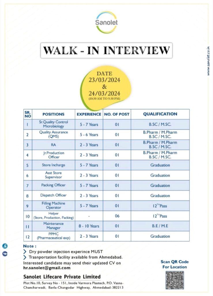 Sanolet Lifecare walk in interview for multiple openings in QA, QC, RA, Store, Maintenance, PPMC on 23rd & 24th March 2024