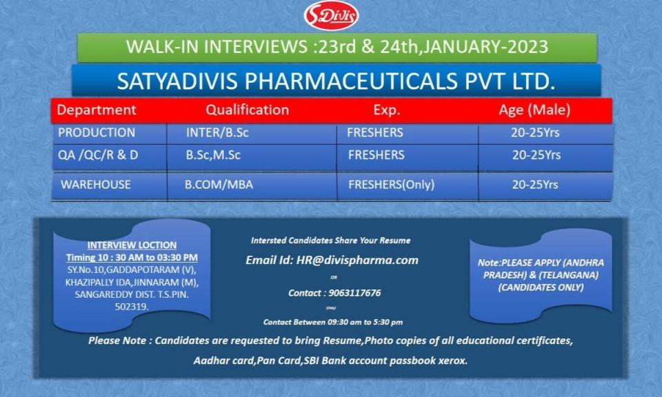SATYADIVIS – Walk In Interview for B.Sc/ M.Sc/ B.COM/ MBA FRESHERS in PRODUCTION/ QA/ QC/ R&D/ WAREHOUSE on 23rd & 24th, 2023