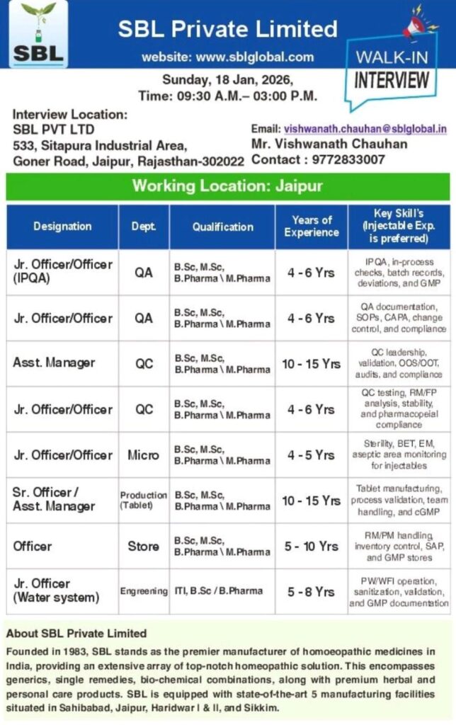 SBL Private Limited, a premier manufacturer of homeopathic medicines in India since 1983, has announced a major walk-in interview drive for its Jaipur location. The company, known for its extensive range of homeopathic solutions, herbal products, and personal care items, is looking for experienced professionals to join its state-of-the-art manufacturing team.