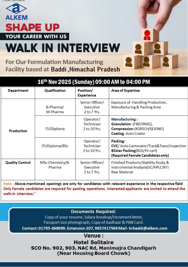 Alkem Laboratories, a leader in the pharmaceutical industry, invites qualified and experienced candidates to a Walk-in Interview for their state-of-the-art Formulation Manufacturing Facility based in Baddi, Himachal Pradesh.