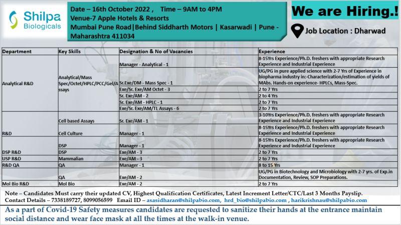 Shilpa Biologicals Walk In Interview for Analytical R&D, R&D, R&D QA, USP R&D, DSP R&D, Mol Bio R&D department on 16th October 2022