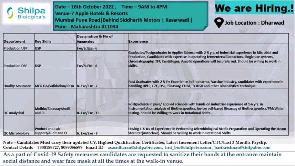 Shilpa Biologicals Walk In Interview for Production, Quality Assurance, QC Analytical & QC Microbiology on 16th October 2022