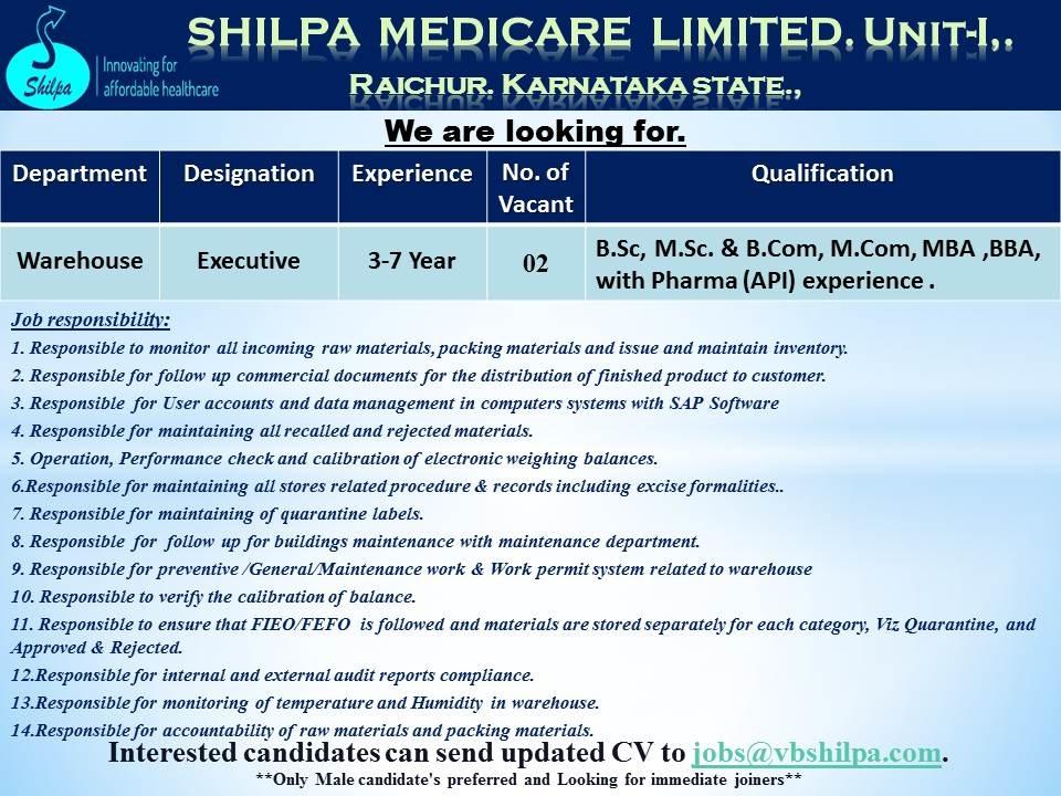 Interested candidates can send updated CV to jobs@vbshilpa.com.