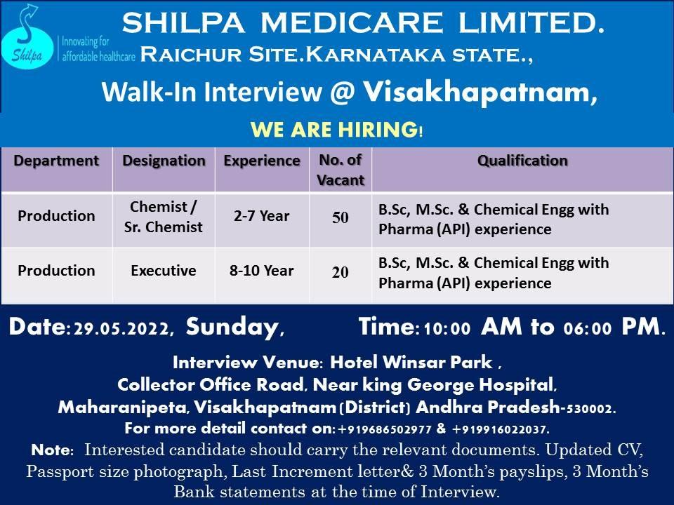 SHILPA MEDICARE LIMITED Walk-In Interview @ Visakhapatnam for Production (API) on 29/05/2022 || 70 Positions