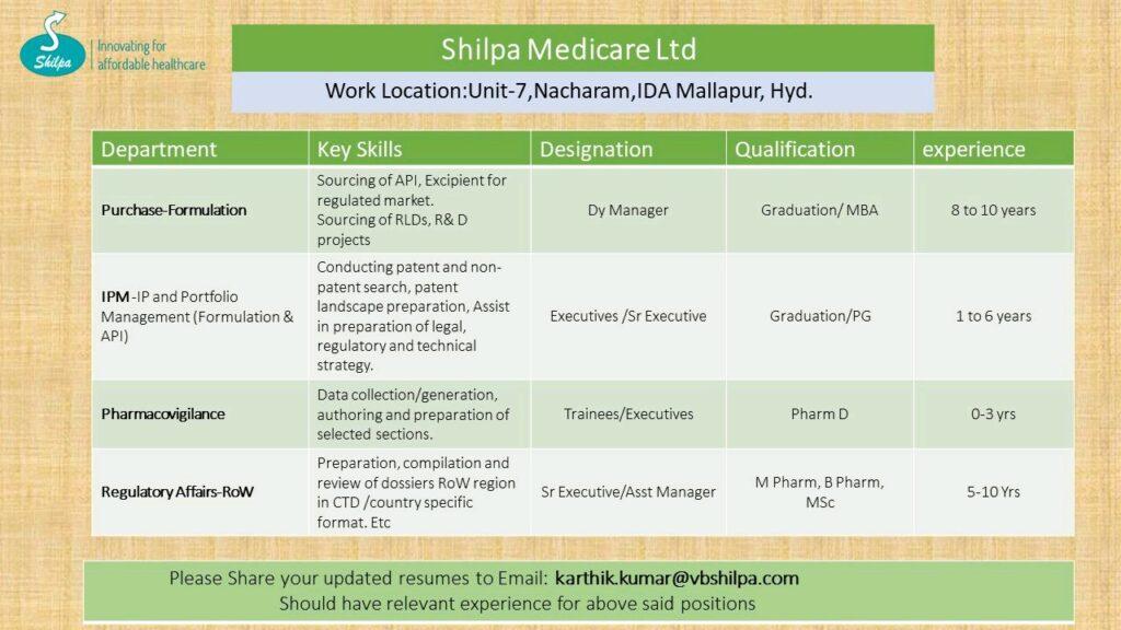 Shilpa Medicare Ltd- Job vacancy for Freshers & experience in Pharmacovigilance, Regulatory Affairs, Purchase & IPM-IP and Portfolio Management