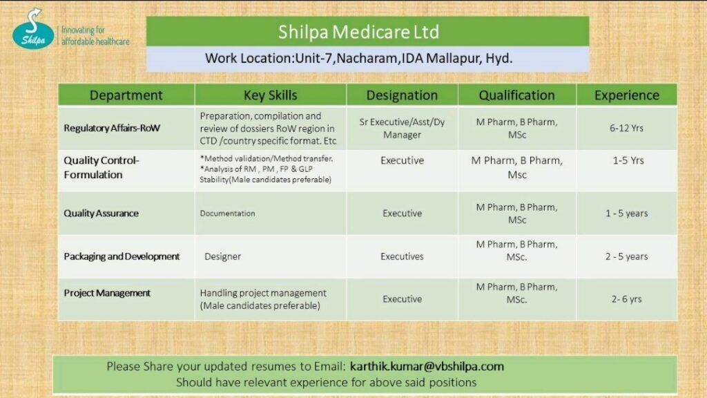 Shilpa Medicare Ltd- Job vacancy for Regulatory Affairs-ROW, Quality Control- Formulation, Quality Assurance, Packaging and Development, Project Management department