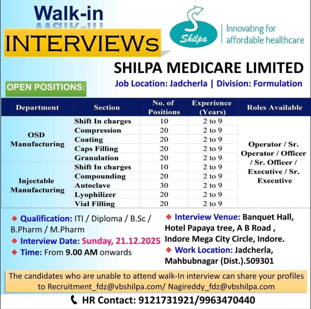 Shilpa Medicare Limited, a leading name in providing affordable healthcare solutions, is hosting a mega walk-in recruitment drive in Indore on December 21, 2025. This is a prime opportunity for pharmaceutical professionals to join their Formulation division located in Jadcherla, Mahbubnagar.