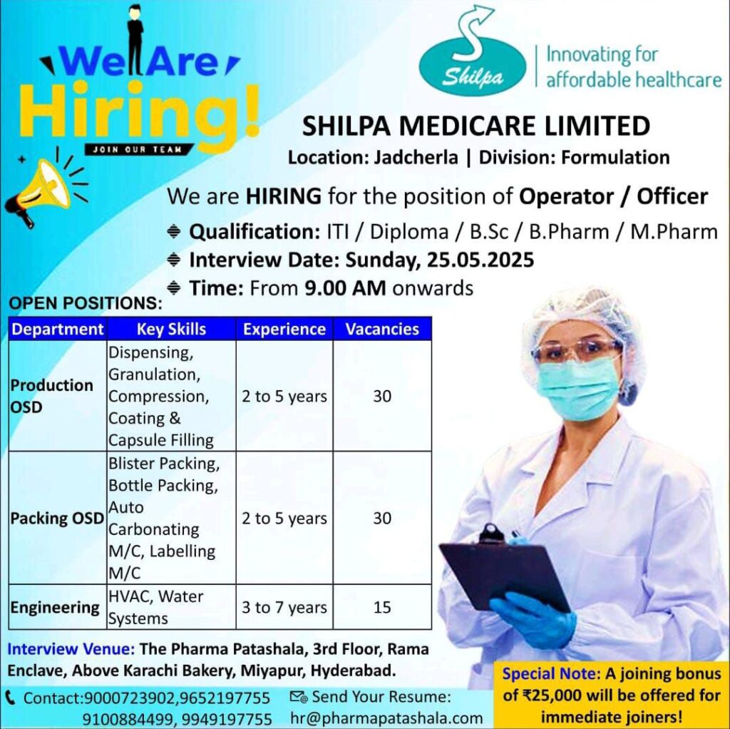 Interview Venue: The Pharma Patashala, 3rd Floor, Rama Enclave, Above Karachi Bakery, Miyapur, Hyderabad.