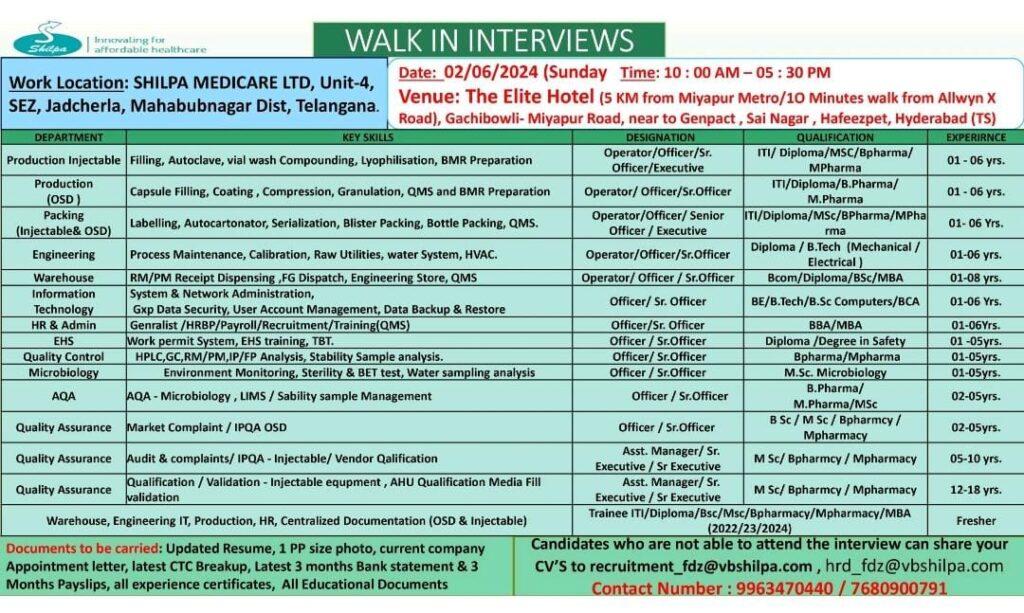 SHILPA MEDICARE walk in interview for Production, Packing, Warehouse, QA, QC, Micro, HR, EHS, IT on 02/06/2024 (Sunday)