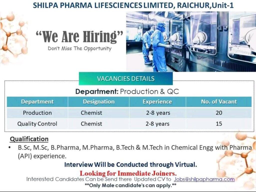 Interested Candidates Can be Send there Updated CV to Jobs@shilpapharma.com