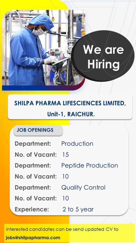 Interested candidates can be send updated CV to jobs@shilpapharma.com
