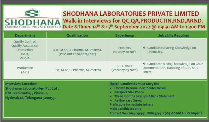 SHODHANA LABORATORIES Walk-in Interviews for QC,QA, Production, R&D, AR&D department on 14th & 15th September 2022