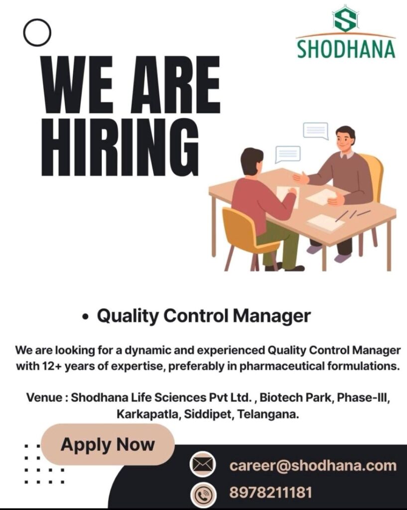 Shodhana Life Sciences Pvt Ltd. is currently seeking a dynamic and experienced professional for the position of Quality Control Manager.