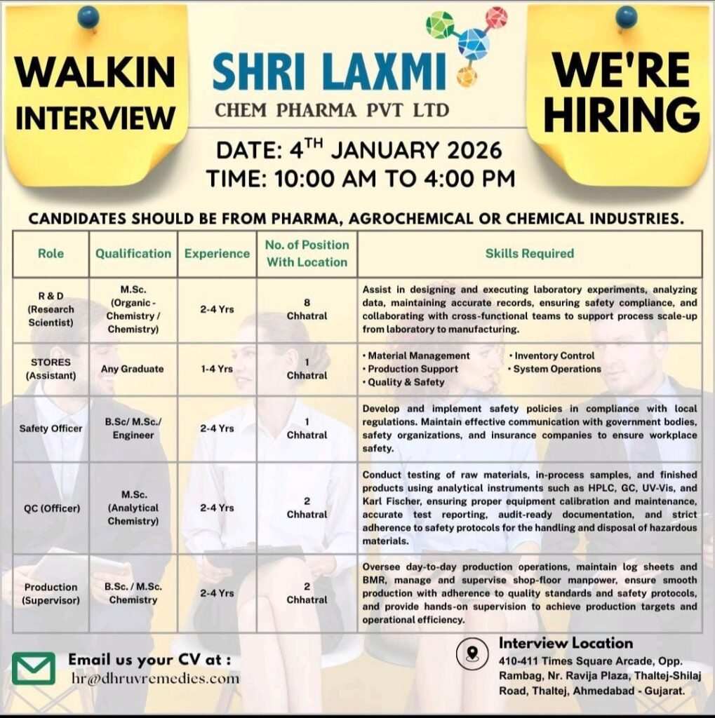Shri Laxmi Chem Pharma Pvt Ltd has announced a walk-in interview drive for various technical and administrative roles at their Chhatral location. The company is actively seeking experienced professionals from the pharma, agrochemical, or chemical industries to join their growing team.