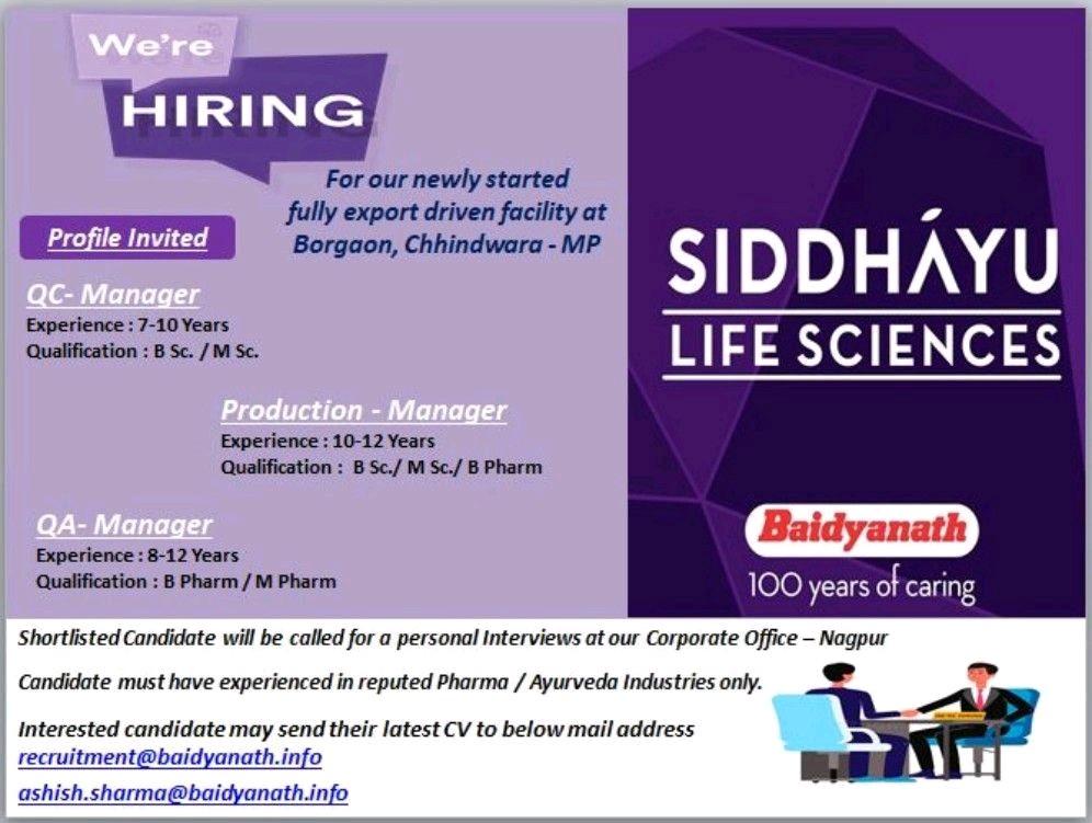 SIDDHAYU LIFE SCIENCES Job vacancy for QC-Manager, Production – Manager & QA-Manager at Borgaon, Chhindwara – MP