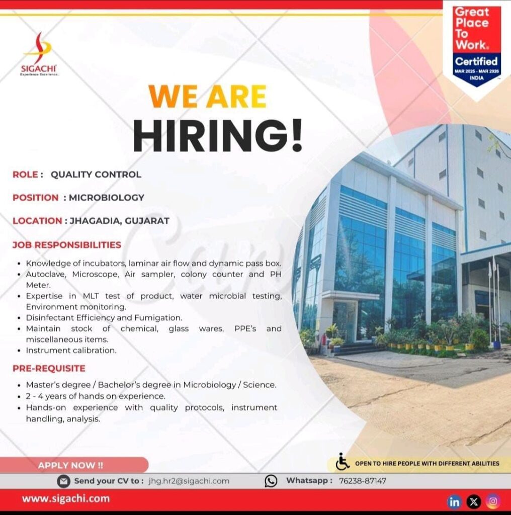 Sigachi Industries, a reputed and Great Place to Work Certified organization, has announced new job openings for the role of Quality Control – Microbiology at their facility located in Jhagadia, Gujarat. The company is seeking skilled microbiology professionals with hands-on experience in laboratory practices, environmental monitoring, and microbial testing.