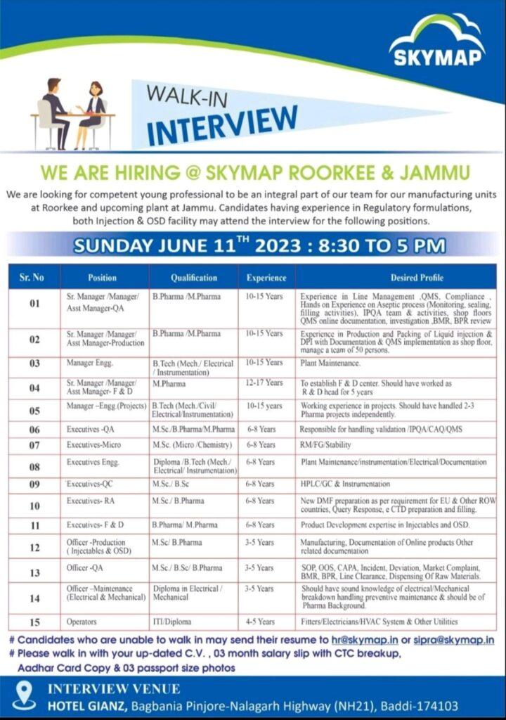 SKYMAP Walk In Interview for Production (Injectables & OSD), QA, F&D, RA, Engineering, Micro, Maintenance on 11th June 23