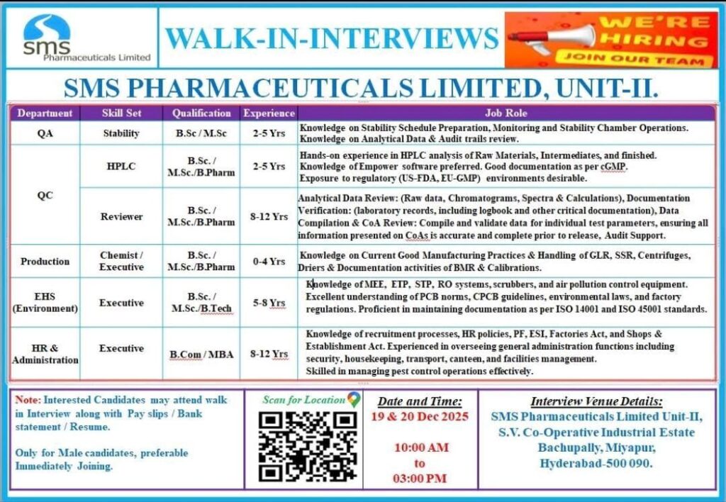 SMS Pharmaceuticals Limited, Unit-II, is conducting Walk-In Interviews on December 19 & 20, 2025, in Hyderabad for various positions in Quality Assurance (QA), Quality Control (QC), Production, Environment, Health, and Safety (EHS), and Human Resources & Administration (HR & Admin). The interviews will be held from 10:00 AM to 03:00 PM.