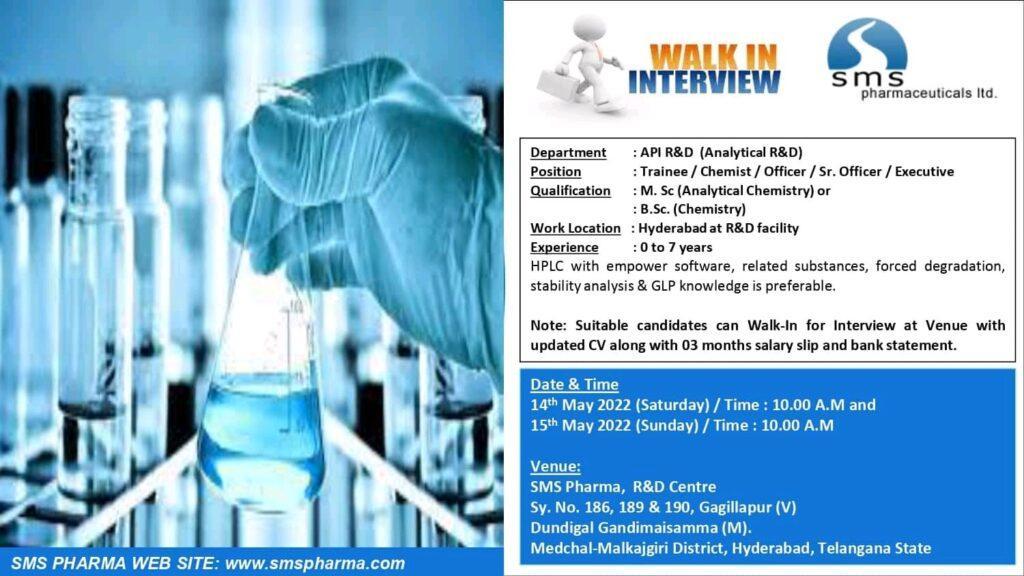 sms pharmaceuticals ltd. Walk in Interview on 14th & 15th May 2022 || Freshers & experience R&D (Analytical R&D)