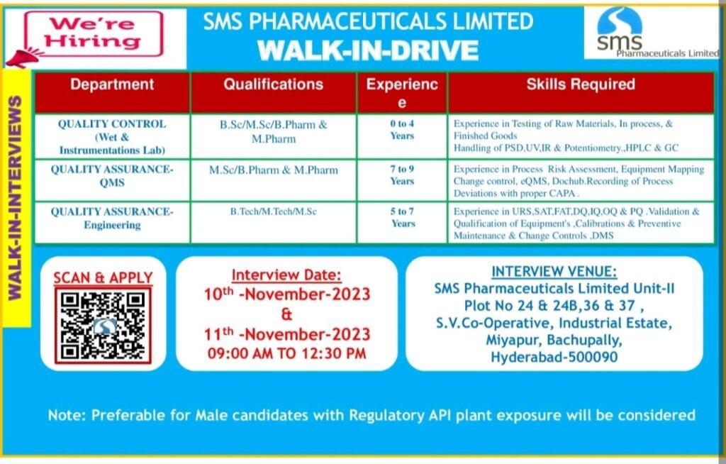 SMS Pharmaceuticals Walk in Drive for Freshers & experience in QA & QC department on 10th & 11th November 2023