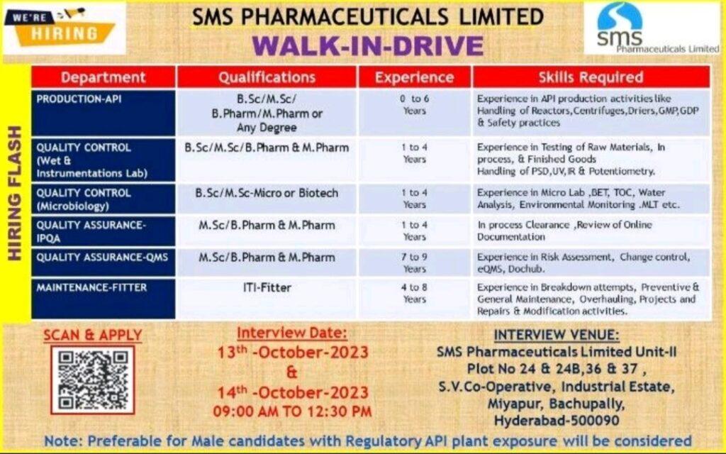SMS Pharmaceuticals- Walk In Interview for Freshers & Experience- Production, QA, QC department | 14th-October-2023