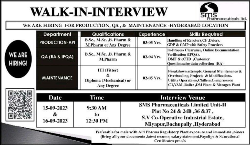 SMS Pharmaceuticals Walk In Interview for multiple positions | 15-09-2023 & 16-09-2023