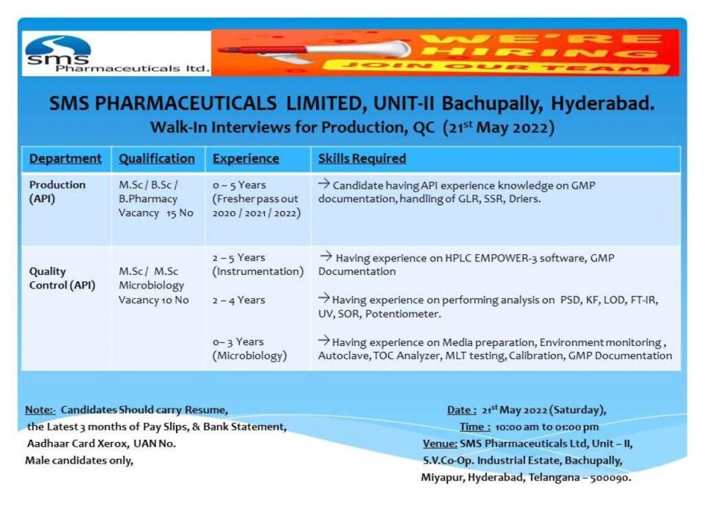 SMS PHARMACEUTICALS LIMITED, UNIT-II Bachupally, Hyderabad. Walk-In Interviews for Production, QC (21st May 2022)
