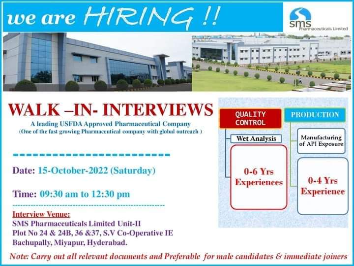 SMS Pharmaceuticals Walk-Ins for Quality Control /Production department on 15th October 2022 – Freshers & experience