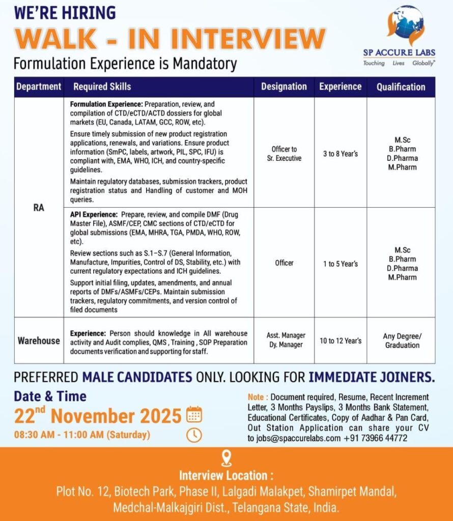 SP Accure Labs, a globally recognized pharmaceutical organization, has announced a Walk-In Interview for multiple positions across Regulatory Affairs (RA) and Warehouse departments. The company is seeking skilled and qualified professionals with mandatory formulation experience for RA roles. This drive is specifically open to male candidates and those who can join immediately.