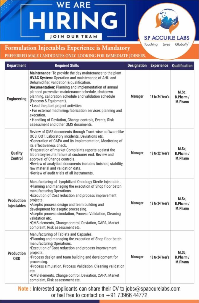 For the Oral Solid Dosage (OSD) department, SP Accure Labs requires a Manager to lead the manufacturing of tablets and capsules. Similar to the injectable role, this position involves managing shop floor operations, process improvement projects, and team building.