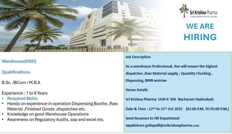 Sri Krishna Pharma, a reputed pharmaceutical organization known for its quality standards and operational excellence, is conducting a walk-in recruitment drive for Warehouse (OSD) professionals at its Unit-II, IDA Nacharam, Hyderabad facility.