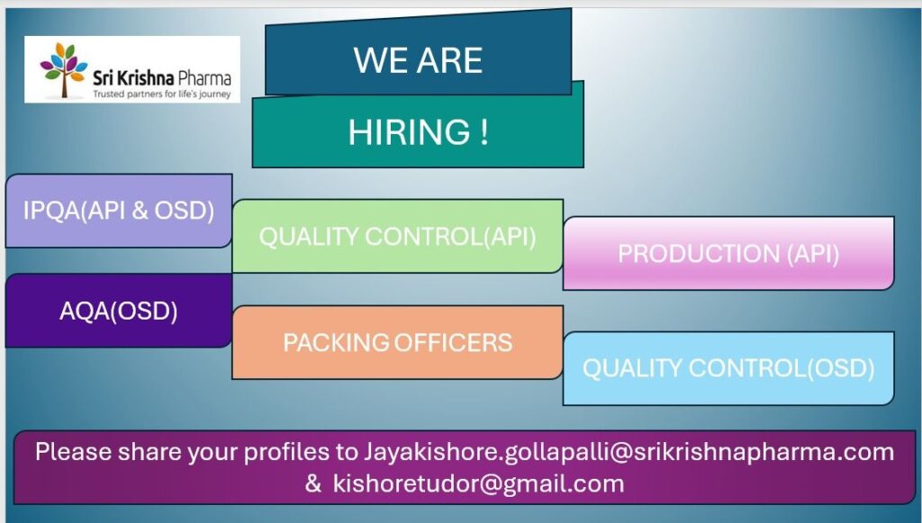 Sri Krishna Pharmaceuticals, a well-established name in the pharmaceutical industry, is currently expanding its workforce. The company has announced several key job openings across multiple departments for its Active Pharmaceutical Ingredients (API) and Oral Solid Dosage (OSD) divisions.