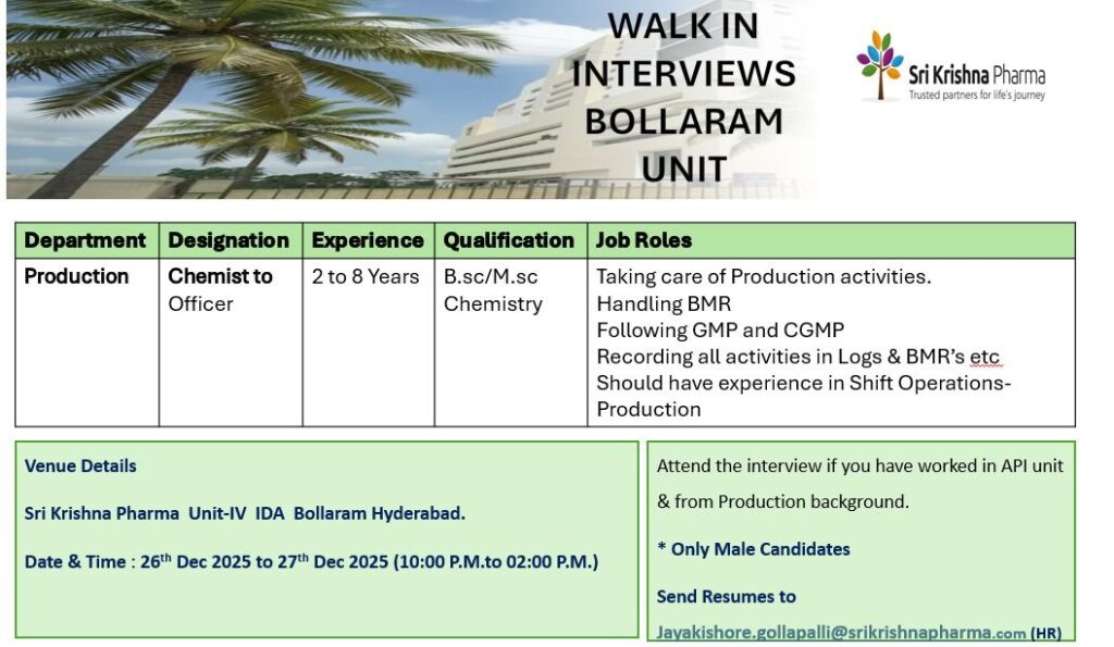 Sri Krishna Pharmaceuticals, a trusted partner in the pharmaceutical industry, is hosting a walk-in recruitment drive for its Bollaram Unit in Hyderabad. This hiring event focuses on strengthening the Production department with experienced professionals who have a background in API (Active Pharmaceutical Ingredient) units.