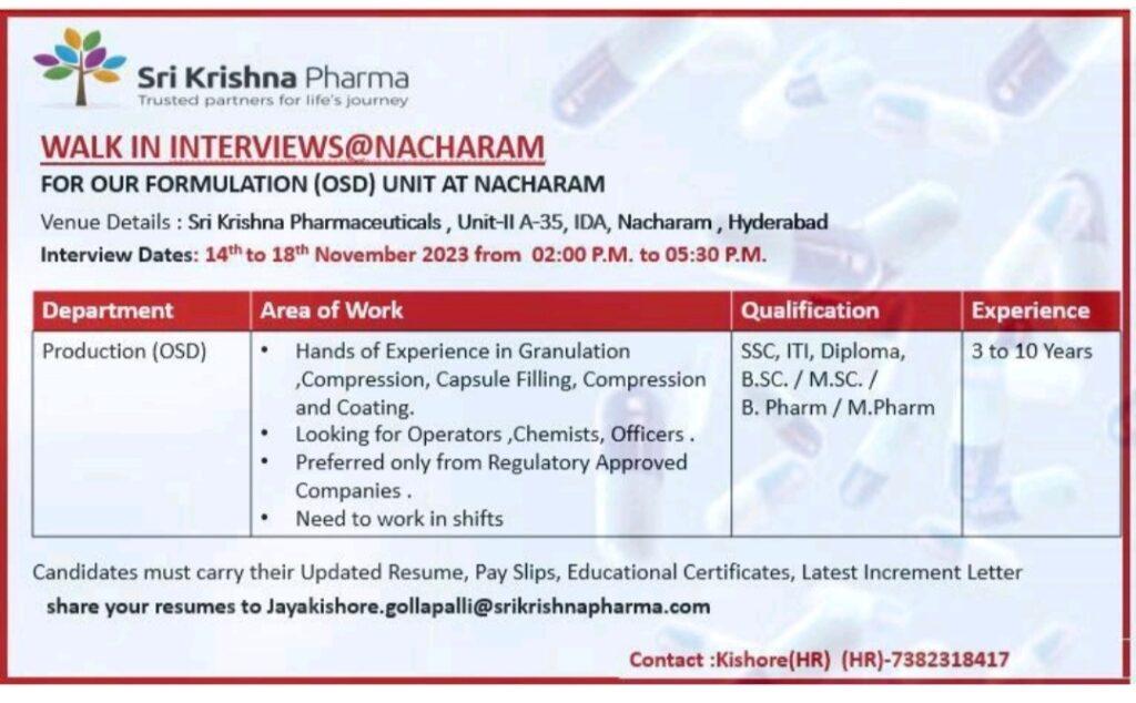 Sri Krishna Pharma Walk In Interview for Production (OSD) on 14th to 18th November 2023