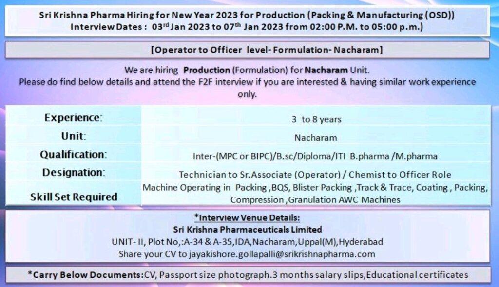 Sri Krishna Pharma Hiring for New Year 2023 for Production (Packing & Manufacturing (OSD)) Interview Dates: 03rd Jan 2023 to 07th Jan 2023 from 02:00 P.M. to 05:00 p.m.)
